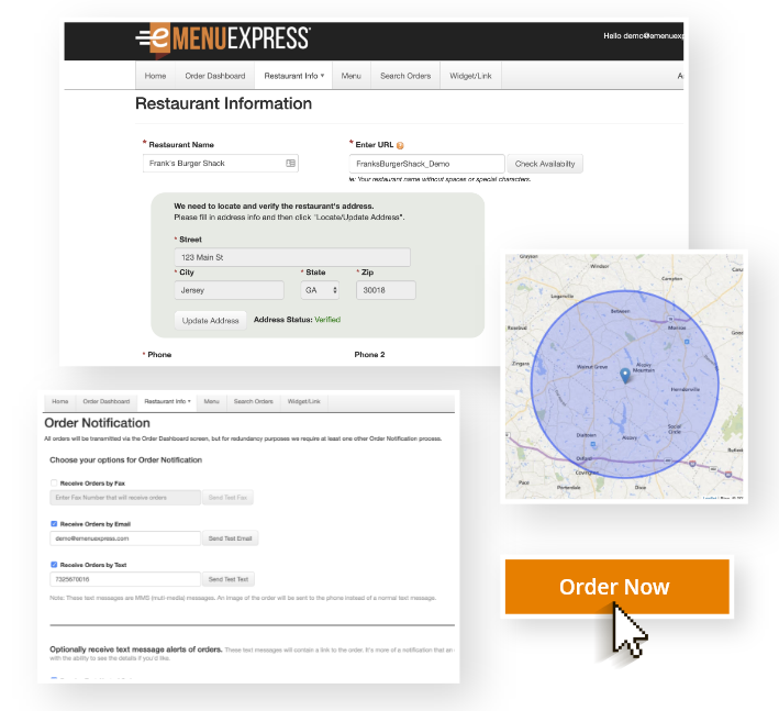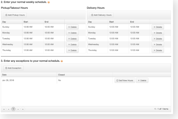 After you register, you'll be walked through the setup process (e.g. Restaurant Info, Schedule, Menu, Delivery Area, Notification Options)